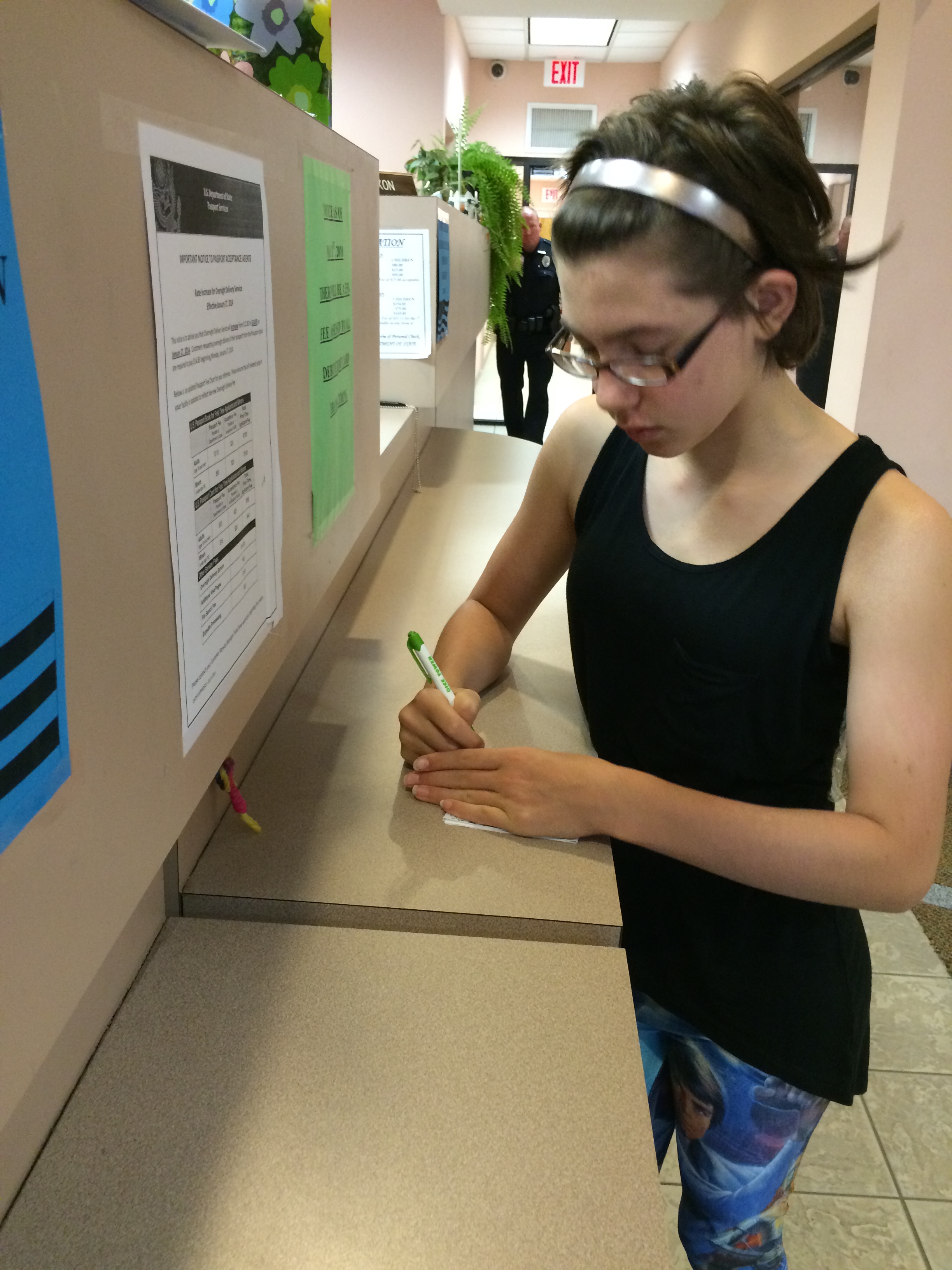 only a few people deep. We started completing the paperwork and the little people played a silly game on the iPad. Goose remembered her social security number and put it on the form using her silly story to remember it.